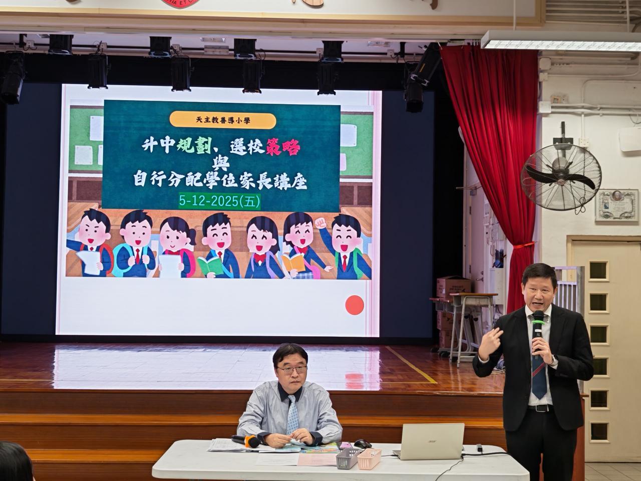 小六選校在即,本校安排自行分配學位講座讓家長了解選校程序,當天還邀請長沙灣天主教英文中學潘校長及聖母玫瑰書院歐校長分享選校資訊及面試心得,讓家長們更能了解選擇程序及對中學的認識。