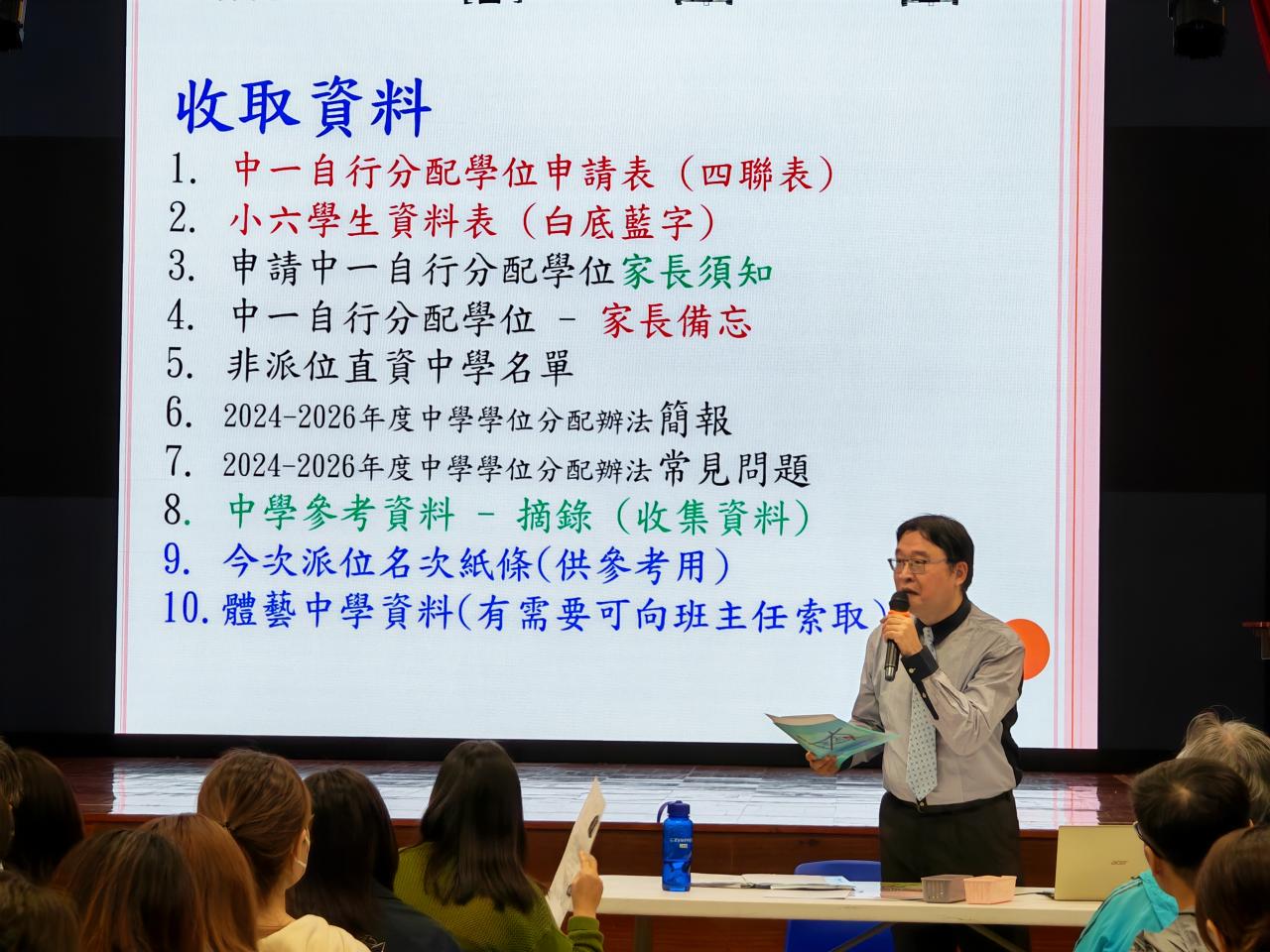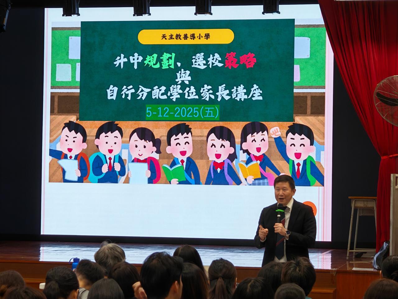 小六選校在即,本校安排自行分配學位講座讓家長了解選校程序,當天還邀請長沙灣天主教英文中學潘校長及聖母玫瑰書院歐校長分享選校資訊及面試心得,讓家長們更能了解選擇程序及對中學的認識。
